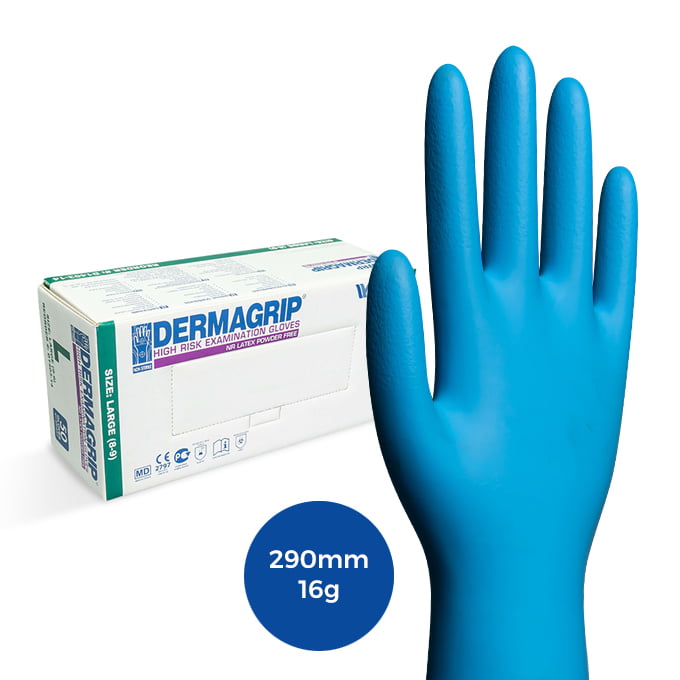 DERMAGRIP® Latex High Risk poedervrije onderzoekshandschoenen bieden ongeëvenaarde en extra bescherming in risicovolle situaties. Deze handschoenen zijn dikker en sterker dan normale onderzoekshandschoenen en zijn de ideale keuze in situaties zoals trauma, verwerking van medisch afval en decontaminatie. Ze zijn vooral geschikt voor gebruik door hulpverleners, zoals ambulancepersoneel, brandweerlieden en politieagenten.