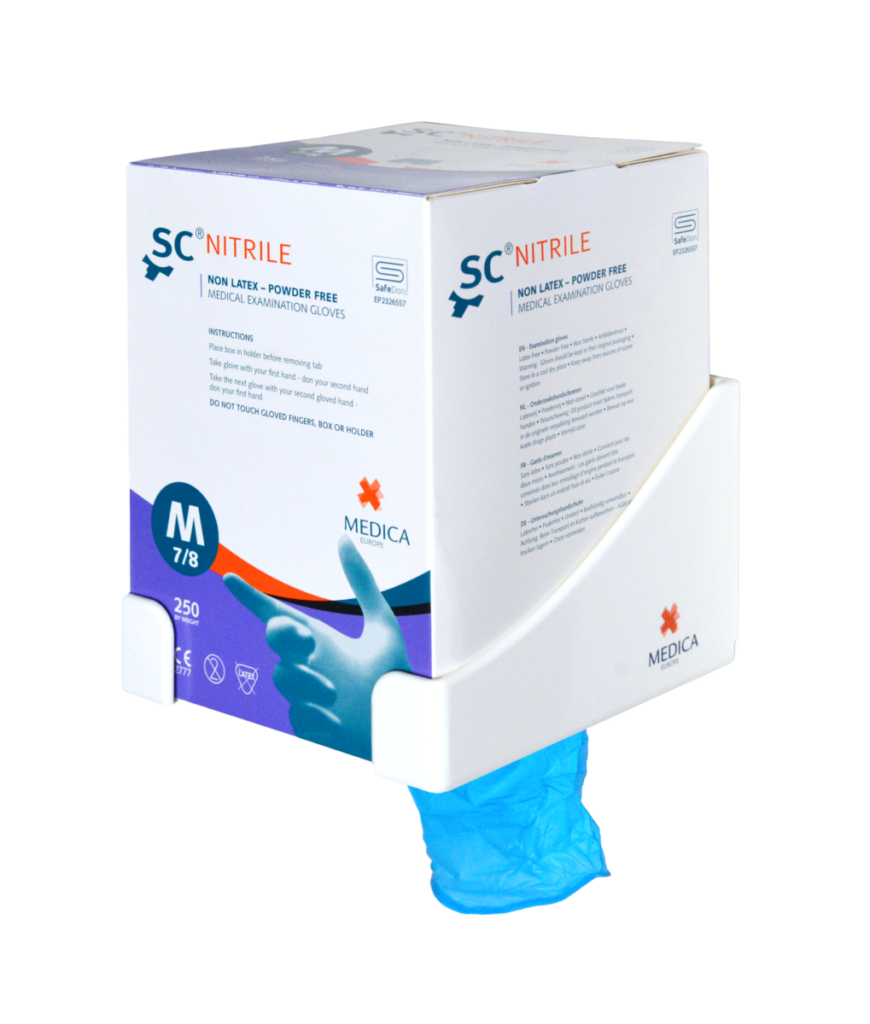 - De compacte wandhouder houdt de handschoenen ver weg van geïnfecteerde oppervlaktes.